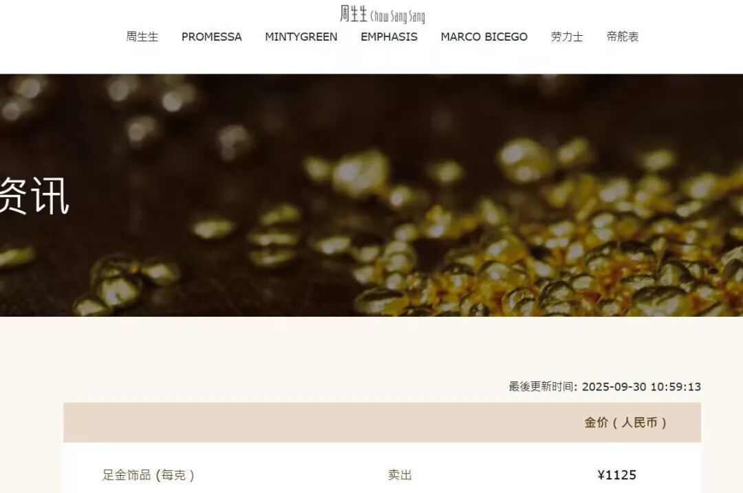 国际金价近日连创新高,涨势不止,现货黄金向上触及3850美元/盎司。 9月30日,国内多家黄金珠宝品牌金饰价格持续攀升,其中,周生生足金饰品报价1125元/克,较昨日上涨14元/克。 更新于2025年09月30日 09:40:00 足美 1123 元/克 (饰品、工艺品类) 周大福、六福珠宝等多个品牌报1123元/克,较昨日上涨15元/克。 周 大 福 SINCE 1929 今日金价 電力 × 半 零售金价 997 元/克 投资黄金类 半 黄金增值服务 黄金增值服务金价 992元/克 ( 金条、金章不作增值服务) 黄金回收服务 以上为今日即时金价,部分货品工费另计 新品推荐 841 元/克 黄金回收服务金价 ...
