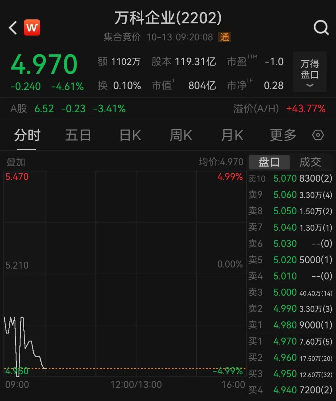 | < w | 万科企业(2202) | | | | --- | --- | --- | --- | | 集合竞价 10-13 09:20:08 通 | | | | | 4,970 万得 | | | | | 盘口 -0.240 -4.61% 换 0.10% 市值 804亿 市净 0.28. | | | | | A股 6.52 -0.23 -3.41% 溢价(A/H) +43.77% | | | | | 分时 五日 | | | | | 鲁加 均价:4.970 盘口 成交 | | | | | 5.470 4.99% 卖10 5.070 8300(2) | | | | | 卖9 5.060 3.30万(4) | | | | | 5.050 1.50万(2) | | 378 | | | 5.040 1.30万(1) | | 37 | | | 5.030 -- (0) | | 三6 | | | 0.00% [买5 5.020 5000(1) 5.210 | | | | | 卖4 5.010 -- (0) | | | | | 5.000 40.40万(14) | | 323 | | | 327 | | | 4.990 3 ...