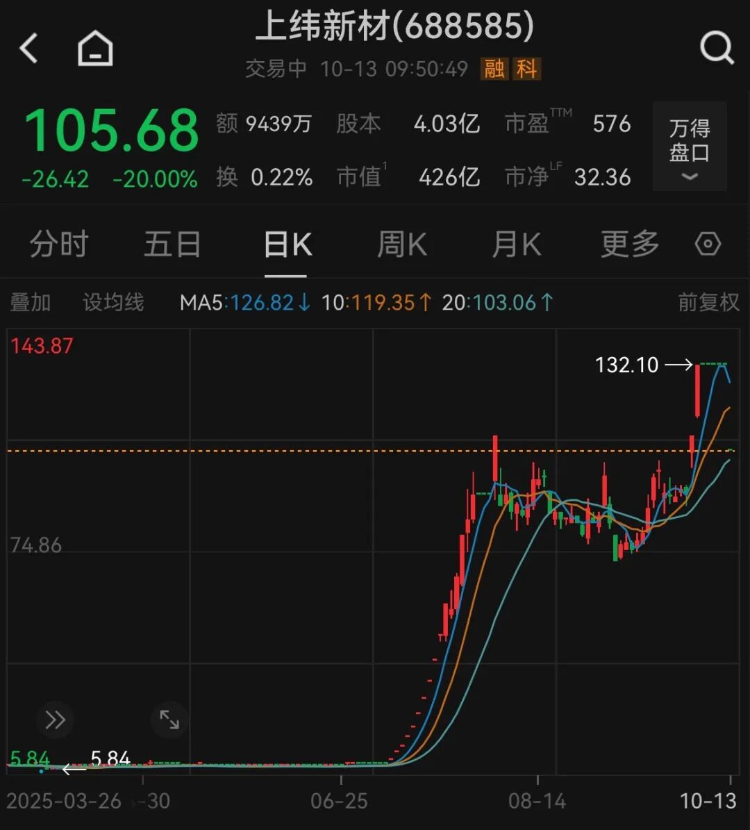 尽管上纬新材已经多次重申,市场对上纬新材和智元的想象似乎没那么容易停止。 上纬新材自9月26日开始起停牌核查,截至10月10日收盘,已停牌5个交易日。在本轮股票交易停牌核查结果的公告中,上纬新材明确表示,未来36个月内, 智元创新不存在通过上市公司"借壳上市"的计划或安排。 同时,上纬新材披露,公司已经在9月24日收到智元恒岳就本次要约收购事宜出具的《上纬新材料科技股份有限公司要约收购报告书》,要约收购价格、拟 要约收购股数等相关内容均无变化。在公司基本面上,上纬新材重申目前公司基本面未发生重大变化,主营业务未发生重大变化,生产经营未发生重大变 化,市场环境或行业政策未发生重大调整。 根据公告中披露的情况,2025年7月9日-2025年9月26日期间,公司股票交易8次触及股票交易异常波动情形,7次触及股票交易严重异常波动情形,公司已累 计发布16次异常波动、严重异常波动、交易风险提示公告,提示股票交易风险。 在本次停牌核查前的一个交易日中,上纬新材再次涨停,收盘报价132.1元/股。万得数据显示,年初至今,上纬新材已经上涨1493.28%。 10月13日,上纬新材(688585.SH)复盘,开盘20cm跌停。 ...