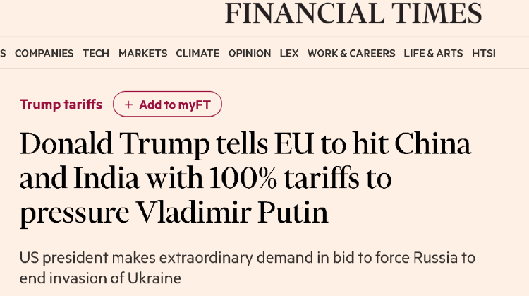 地缘政治与贸易政策 - 美国总统特朗普要求欧盟对购买俄罗斯能源的中国和印度加征100%关税以施压俄罗斯结束俄乌冲突[1] - 美方提议欧盟率先对中印实施关税措施 美方承诺后续跟进但要求欧盟先行动[4] - 欧盟对关税措施持谨慎态度 因中印与欧洲贸易关系紧密且部分欧盟国家仍进口俄罗斯能源[4] 国际贸易关系动态 - 美国与印度贸易谈判正在进行中 特朗普计划数周内与印度总理莫迪会面[4] - 特朗普通过社交媒体确认美印贸易进展 但未提及具体谈判细节[5]