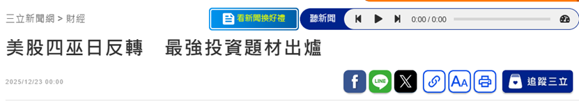报道还提到,AI 并没有走完它最关键的那一段。政策端正在把需求延伸成长期任务,企业端则用财报证明,时代的商 业模式已经开始运转;当这两条线同时被验证,"资本市场剩下要做的,只是重新校准价格,而不是再问要不要相 信。" 三立新闻网也发文称,AI 被纳入美国国家级计划与政府采购的框架,不再只是企业愿不愿意投资的选项,而是被视为 必须持续投入的基础能力;股价创新高只是必然,重点是除了短期数字,而是需求结构的改变。 【环球网财经综合报道】北京时间12月23日凌晨,美国三大股指全线收涨,道指涨0.47%报48362.68点,标普500指数 涨0.64%报6878.49点,纳指涨0.52%报23428.83点。默克涨超3%,摩根大通涨近2%,领涨道指。万得美国科技七巨头 指数涨0.41%,特斯拉、英伟达涨超1%。 市场分析人士称,AI交易重新受到市场追捧,交易员们正在观察科技股能否在年底前重拾上涨势头。日本47新闻发文 称,对于人工智能(AI)相关需求的乐观情绪蔓延,促进了买入交易。 ...