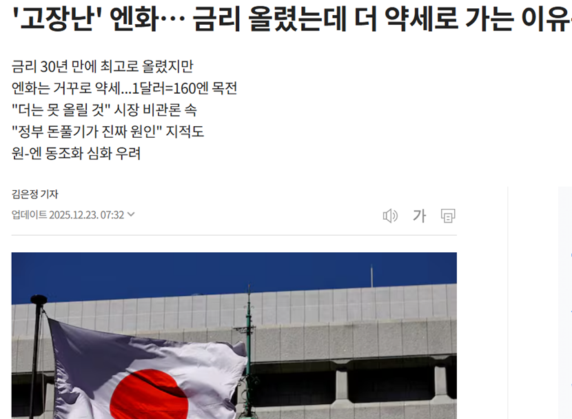 【环球网财经综合报道】日本央行上周加息激发新一轮日元抛售潮,在利率上调前的12月18日,日元曾跌至1美元兑 155.4日元,利率宣布后立即涨至1美元兑157.7日元。 《朝鲜日报》发文称,由于美国提前降息,日本的利率上调缩小了两国间的利差,原本市场预期这会缓解日元的弱 势,但实际上日元贬值约1.5%,以至于出现"日元故障"的说法。 三菱UFJ金融集团则分析指出,最近日本国债利率上升并非源于对快速经济增长的预期,而是反映了对财政恶化和日 本国债吸收能力的担忧,这并未驱动日元走强。 报道还提到,面对年内最低的日元汇率跌至160日元的状况,日本财务大臣麻生太郎表示:"日元的单边和突然的波 动,特别是自上周货币政策会议之后的动向,令人非常担忧。我们将准备对过度的波动采取适当的应对措施。" ...