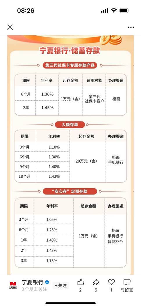 【环球网财经综合报道】临近年末,诸多中小银行大额存单密集"上新"。12月份以来,江苏苏商银行、 武汉众邦银行、宁夏银行等多家区域性银行推出新一期大额存单产品。 日前,宁夏银行官方微信公众号发布信息显示,该行发售3个月至18个月期限的大额存单,起存金额20 万元(含),3个月期年利率1.10%,18个月期年利率1.43%。 08:26 .Il ? ■ | × | | | | | | --- | --- | --- | --- | --- | | | | 宁夏银行·储蓄存款 | | | | 0 | | 第三代社保卡专属存款产品 | | | | 期限 | 年利率 | 起存金额 | 适用对象 | 办理渠道 | | 6个月 | 1.30% | 1万元(含) | 第三代 社保卡客户 | 柜面 | | 2年 | 1.45% | | | | | | 9 | 大额存单 | 0 | | | 期限 | 年利率 | | 起存金额 | 办理渠道 | | 3个月 | 1.10% | | | | | 6个月 | 1.30% | | 20万元(含) | 柜面 | | 9个月 | 1.40% | | | 手机银行 | | 18个月 | 1.4 ...