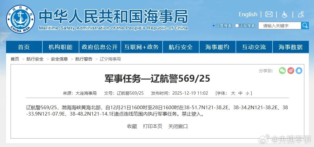 据中国海事局网站消息,大连海事局发布航行警告,12月21日16时至28日16时,渤海海峡黄海北部部分海域执行军事任务,禁止驶入。 ...