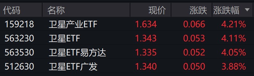 | 代码 | 名称 | 现价 | | 涨跌 涨跌幅 ▼ | | --- | --- | --- | --- | --- | | 159218 | 卫星产业ETF | 1.634 | 0.066 | 4.21% | | 563230 | 卫星ETF | 1.343 | 0.053 | 4.11% | | 563530 | 卫星ETF易方达 | 1.335 | 0.052 | 4.05% | | 512630 | 卫星ETF广发 | 1.340 | 0.050 | 3.88% | 有券商表示,随着发射成本下降与在轨算力提升,未来太空算力有望形成"多发多省"格局,随着技术迭代与配套完 善,太空算力和其他新兴应用有望推动商业航天迎来具备规模化商业价值的产业变革。 (文章来源:每日经济新闻) 卫星概念股午后大幅拉升,中国卫星、北斗星通涨停。 受盘面影响,卫星相关ETF涨约4%。 ...
