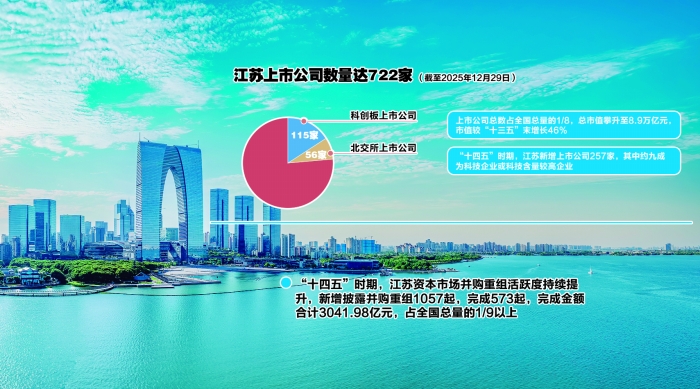 江苏上市公司整体发展概况 - 截至2025年12月29日,江苏上市公司数量达722家,占全国总量的1/8,总市值攀升至8.9万亿元,市值较“十三五”末增长46% [2] - 千亿元市值公司增至11家,科创板、北交所上市公司数量分别达115家、56家,均稳居全国第一 [2] - “十四五”时期,江苏上市公司实现首发融资2259.71亿元、再融资3852.79亿元,全国排名第四 [2] 经营业绩与“硬科技”成色 - 2025年上半年,江苏上市公司合计实现营业收入1.7万亿元,同比增长1.2%,占全省GDP比重超1/4;合计实现净利润1527亿元,同比增长3.7% [3] - 六成公司营收规模扩大,四成公司营收超10亿元,45家公司营收增幅超50%;八成公司实现盈利,五成公司净利润同比正增长,137家净利润增幅超50% [3] - “十四五”时期新增上市公司257家,其中约九成为科技企业或科技含量较高企业 [3] - 截至2025年底,江苏上市公司已覆盖16个先进制造业产业集群和50条产业链,拥有国家级专精特新“小巨人”企业373家、战略性新兴产业上市公司305家,两类企业数量均占全国同类公司约1/6 [3][4] 科技龙头与创新突破 - 半导体企业通富微电通过IPO、再融资累计募集资金约107.56亿元,截至2024年末,其销售收入、净利润较2020年末均实现翻番,已成长为全球排名第四的准一线封测企业 [4] - 生物医药企业迪哲医药于2025年7月有一款创新药获美国FDA批准上市,成为我国首个独立研发、在美获批的全球首创新药 [4] 并购重组活动 - “十四五”时期,江苏新增披露并购重组1057起,完成573起,完成金额合计3041.98亿元,占全国总量的1/9以上 [5] - 制造业上市公司是并购重组主力军,累计发起216起,主要集中在机械设备、半导体、医药生物等领域 [6] - 2025年,华海诚科以11.2亿元收购衡所华威剩余70%股权;松发股份收购恒力重工成为“并购六条”后首单落地的跨界并购案例 [6] - 部分并购案例终止,显示决策更趋理性审慎,如思瑞浦终止收购奥拉股份,帝奥微终止收购荣湃半导体 [6] 股东回报与市场生态 - “十四五”时期,江苏上市公司累计分红3946亿元,较“十三五”时期增长45.4%;股利支付率提升至37.8%,较“十三五”时期提高4.6个百分点 [7] - 103家上市公司累计分红金额超过其股权融资金额;2025年有162家公司计划开展中期分红,同比增长11.72% [7] - “十四五”时期,江苏上市公司累计回购金额达523亿元,是“十三五”时期的2.6倍;全省已有70家上市公司获批专项贷款开展回购增持,获批额度近140亿元 [7] - “十四五”时期,江苏证监局共对27家上市公司作出行政处罚 [8] - 2024年成立的“宁法挺您”证券融合法庭,一年来为649名投资者挽损4500余万元 [8]