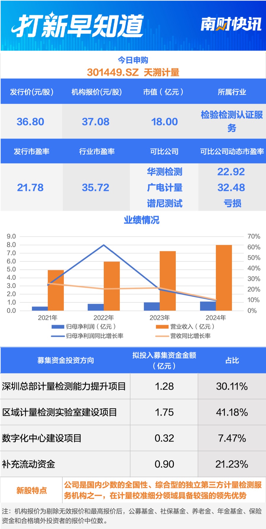 | 募集资金投资方向 | 拟投入募集资金金额 (亿元) | 日比 | | --- | --- | --- | | 深圳总部计量检测能力提升项目 | 1.28 | 30.11% | | 区域计量检测实验室建设项目 | 1.75 | 41.18% | | 数字化中心建设项目 | 0.32 | 7.47% | | 补充流动资金 | 0.90 | 21.23% | 此外,天溯计量自2018年开始布局电池检测服务业务,目前已投建了84大项电池检测能力,拥有电芯、模组、电池包测试通道 2000余个,形成动力电池超快充测试技术、新能源电池五综合可靠性验证检测技术等多项技术创新成果及非标方法。 12月12日,可申购创业板的天溯计量(301449.SZ)与沪市主板的锡华科技(603248.SH)。 天溯计量成立于2009年,是一家全国性、综合型的独立第三方计量检测服务机构,主营业务为计量校准、检测、认证等专业技 术服务。其技术服务范围涵盖几何量、热学、力学、电磁学、光学、电离辐射等十大计量校准领域及综合性专用测量仪器共计 1417项校准能力,可为生物医药、汽车、能源电力、轻工日化等多元领域提供服务。 | 打新早知道 | | | ...