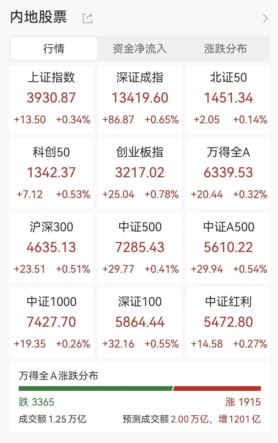 12月23日,A股早盘震荡拉升,截至收盘,沪指涨0.34%,深成指涨0.65%,创业板指涨0.78%。沪深两市半日成交额1.25万亿,较上个交易日放量523 亿。盘面上热点快速轮动,全市场超3300只个股下跌。 | 内地股票 | | | | --- | --- | --- | | 行情 | 资金净流入 | 涨跌分布 | | 上证指数 | 深证成指 | 北证50 | | 3930.87 | 13419.60 | 1451.34 | | +13.50 +0.34% +86.87 +0.65% +2.05 +0.14% | | | | 科创50 | 创业板指 | 万得全A | | 1342.37 | 3217.02 | 6339.53 | | +7.12 +0.53% +25.04 +0.78% +20.44 +0.32% | | | | 沪深300 | 中证500 | 中证A500 | | 4635.13 | 7285.43 | 5610.22 | | +23.51 +0.51% +29.77 +0.41% +29.94 +0.54% | | | | 中证1000 | 深证100 | 中证红利 | | 7427. ...