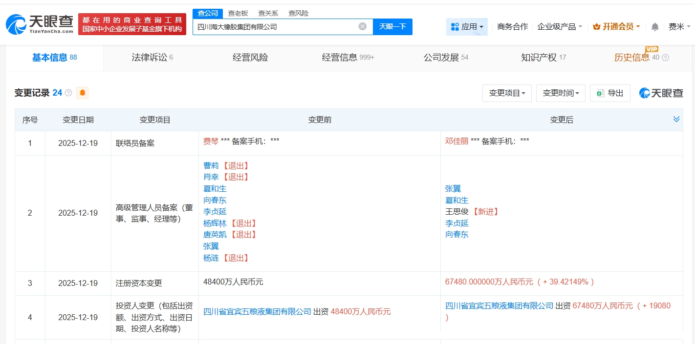 | 大限管 | 都在用的商业查询工具 | 皇公司 童老板 | 查关系 查风险 | | | | | --- | --- | --- | --- | --- | --- | --- | | 国家中小企业发展子基金旗下机构 | | 四川海大橡胶集团有限公司 | × | 天眼一下 | 船 应用 ▼ | 商务合作 | | 基本信息 88 | 法律诉讼 6 | 经营风险 | 经营信息 999+ | | 公司发展 54 | 知识 | | 股东信息 ② ● 品股权结构 | | | | | | | | Alb 股东信息1 历史股东信息2 | 股权变更历程5 2 | VIP | | | | | | 序号 | | 股东名称 | | 持股比例 ÷ | 认缴出资额(万元) ۾ | 认缴出资 | | 10 | 四川省宜宾五粮液集团有限公司 品 | | | 100% O | 67480 | 2009-0 | | 控股股东 | 国有全资 | | | | | | 历史工商信息 工商信息 | 企业名称 | 四川海大橡胶集团有限公司 | | | | | --- | --- | --- | --- | --- | | 法定代表人 | 向春东 凉关联 ...