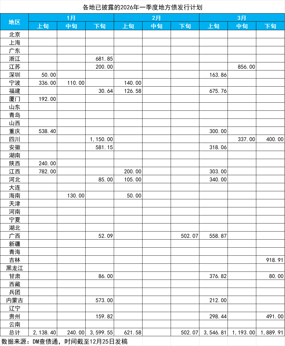 分地区观察,截至发稿时,已披露明年一季度计划发债规模排名前三的依次是:四川(1887亿元)、江西(1285亿元)和广西(1113.03亿 元),其中四川是目前计划发债相对最多的地区。 发行节奏上,各地具体时点上的安排也值得关注。由目前已披露的情况统计,总体发行高峰预计将出现在2026年1月下旬和3月上旬,这两个 时段的地方债发行计划合计超3000亿元,新债一级市场或将形成相对集中的"供给高峰"。 | | | | | 各地已披露的2026年一季度地方债发行计划 | | | | | | | --- | --- | --- | --- | --- | --- | --- | --- | --- | --- | | 地区 | | 1月 | | | 2月 | | | 3月 | | | | 上旬 | 中旬 | 下旬 | 上旬 | 中旬 | 下旬 | 上旬 | 中旬 | 下旬 | | 北京 | | | | | | | | | | | 下海 | | | | | | | | | | | 广东 | | | | | | | | | | | 浙江 | | | 681. 85 | | | | | | | | 江苏 | | | 200. ...