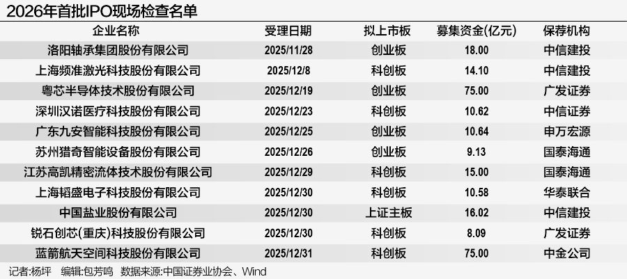 21世纪经济报道记者 杨坪 深圳报道 2026年新年伊始,新一轮IPO现场检查重磅来袭。 1月5日晚间,中证协公布了2026年第一批首发企业现场检查抽签名单,11家拟IPO企业"中签"。 这些企业均为2025年11月~12月受理的项目,其中科创板数量最多,合计有6家企业入选,分别为蓝箭航天、频准激光、高凯技 术、汉诺医疗、韬盛科技、锐石创芯;创业板紧随其后,洛轴股份、粤芯半导体、九安智能、猎奇智能4家企业入选,上证主板 仅中盐股份1家企业入选。 | 企业名称 | 受理日期 | 拟上市板 | 募集资金(亿元) | 保存机构 | | --- | --- | --- | --- | --- | | 洛阳轴承集团股份有限公司 | 2025/11/28 | 创业板 | 18.00 | 中信建投 | | 上海频准激光科技股份有限公司 | 2025/12/8 | 科创板 | 14.10 | 中信建投 | | 粤芯半导体技术股份有限公司 | 2025/12/19 | 创业板 | 75.00 | 广发证券 | | 深圳汉诺医疗科技股份有限公司 | 2025/12/23 | 科创板 | 10.62 | 中信证券 | | 广东九安 ...