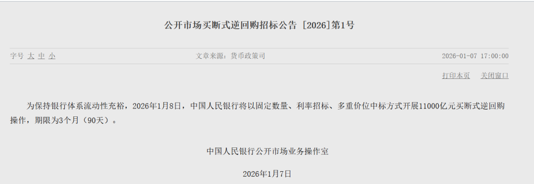 1月7日下午,央行公告,为保持银行体系流动性充裕,2026年1月8日,中国人民银行将以固定数量、利率招标、多重价位中标方式开展11000亿元买断式 逆回购操作,期限为3个月(90天)。 买断式逆回购推出于2024年10月,是中国人民银行主动借出资金,从一级交易商购买债券,来向市场投放流动性的操作。该工具可增强1年以内的流动性 跨期调节能力,有助于提升流动性管理的精细化水平。截至目前,央行已开展了多次买断式逆回购操作。 | 公开市场买断式逆回购招标公告 [2026]第1号 2026-01-07 | | | --- | --- | | 公开市场买断式逆回购招标公告 [2025]第13号 | 2025-12-12 | | 公开市场买断式逆回购招标公告 [2025]第12号 | 2025-12-04 | | 公开市场买断式逆回购招标公告 [2025]第11号 | 2025-11-14 | | 公开市场买断式逆回购招标公告 [2025]第10号 2025-11-04 | | | 公开市场买断式逆回购招标公告 [2025]第9号 | 2025-10-14 | | 公开市场买断式逆回购招标公告 [2025]第8号 | 20 ...