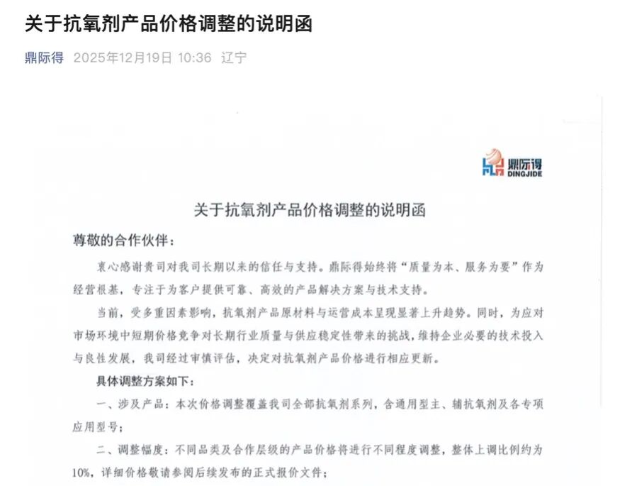 行业动态:抗氧剂行业集体提价 - 国产抗氧剂行业在2023年12月上半月迎来密集调价潮,四家头部企业相继宣布提价,调价幅度高度一致,均为10%左右 [1][4] - 利安隆于12月2日率先发布调价函,拟对抗氧化剂产品上调10%左右 [4] - 宿迁联盛于12月3日跟进,对光稳定剂调价幅度为10%左右 [4] - 风光股份于12月16日宣布主要抗氧剂系列平均涨价10% [4] - 鼎际得于12月19日宣布对公司全部抗氧剂系列产品价格进行更新,整体上调比例约为10% [1][4] 提价背景与原因 - 2023年以来,行业竞争加剧、下游需求放缓及原材料价格波动,导致抗老化助剂行业进入非理性低价竞争阶段,主要厂家产品价格下跌 [5] - 风光股份相关负责人表示,价格调整基于公司自身情况,当前国家提倡反内卷,且抗氧剂行业需求旺盛,公司为调节利润做出调整 [4] - 该负责人强调,当前抗氧剂行业并非产能过剩,公司产品需求一直尚可 [4] 行业与公司财务困境 - 以风光股份为例,其抗氧剂单剂产品毛利率从2023年的16.58%骤降至2024年的3.02%,2025年上半年仅微幅回升至3.26% [6] - 2025年前三季度,风光股份营收同比增长28.8%至9.24亿元,但归母净利润仍亏损0.4亿元 [6] - 同期,鼎际得营收6.36亿元,同比增长12.16%,但归母净利润却下滑15.49%至909.11万元,行业出现增收不增利现象 [6] 市场观点与反应 - 机构看好此次涨价对行业的积极影响,认为随着国内整治"内卷式"竞争深化,龙头企业价格调涨有望助力行业景气底部向上修复、格局优化 [6] - 二级市场反应较为平淡,截至12月19日收盘,宿迁联盛涨1.46%,鼎际得涨0.31%,利安隆涨0.02%,风光股份跌0.69% [7] 行业基本属性 - 抗氧剂是高分子材料助剂的一种,主要通过降低塑料材料自氧化反应速度、延缓塑料材料老化降解实现抗老化功能 [4] - 抗氧剂具有用量比例小但对下游客户的生产和产品质量影响较大的特点,属于高分子材料的必备添加剂 [4]