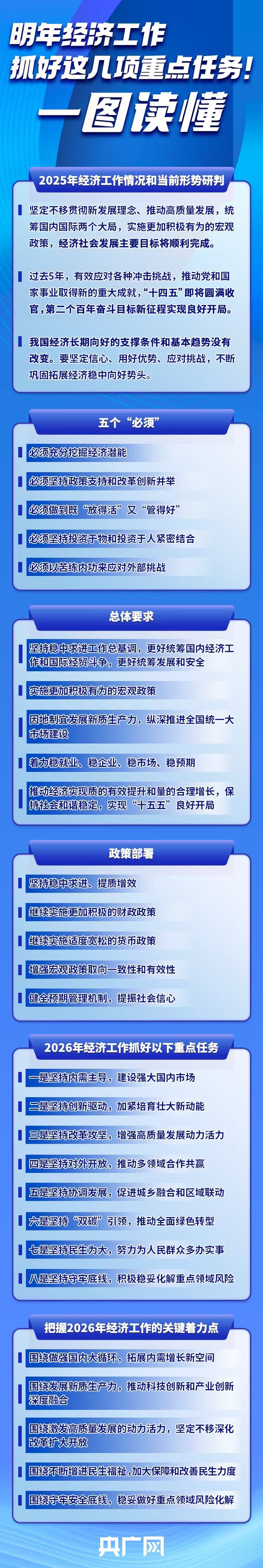 2026年中国经济怎么干?一图读懂! 中央经济工作会议 12月10日至11日在北京举行 如何做好明年经济工作? 一图梳理↓ 我国经济长期向好的支撑条件和基本趋势没有 改变。要坚定信心、用好优势、应对挑战,不断 巩固拓展经济稳中向好势头。 五个"必须" 240元 - SE S M P 0%列 - 【 的 - 必须做到既"放得活"又"管得好" 0%如果 投资手物和投资于人紧密结合 2%列以普绕内功度应对外部挑战 总体要求 上一篇: - 140 11 12 2 7 2 暨続急中发起工作总基调,更好统筹国内经济工 假和国际经贸科争,更好统筹发展和安全 初审:李振斌 复审:王进 终审:周鹤 圆地制宜发展新质生产力,纵深推进全国统一大 市场推出设 着力稳就业、稳企业、稳市场、稳预期 征远经济ஜ现员的有效提升和量的合理增长,保 持在线和谐稳起。 ஜ现"十五五"良好开局 政策部署 堅持稳中求過。提质增效 继续要就可到加盟网的财政政策 继续到随着原因的货币政策 增强泵观政策取向一致性和有效性 健全预期管理机制,提振社会信心 2026年经济工作抓好以下重点任务 rtt Extrade and and the will be th ...