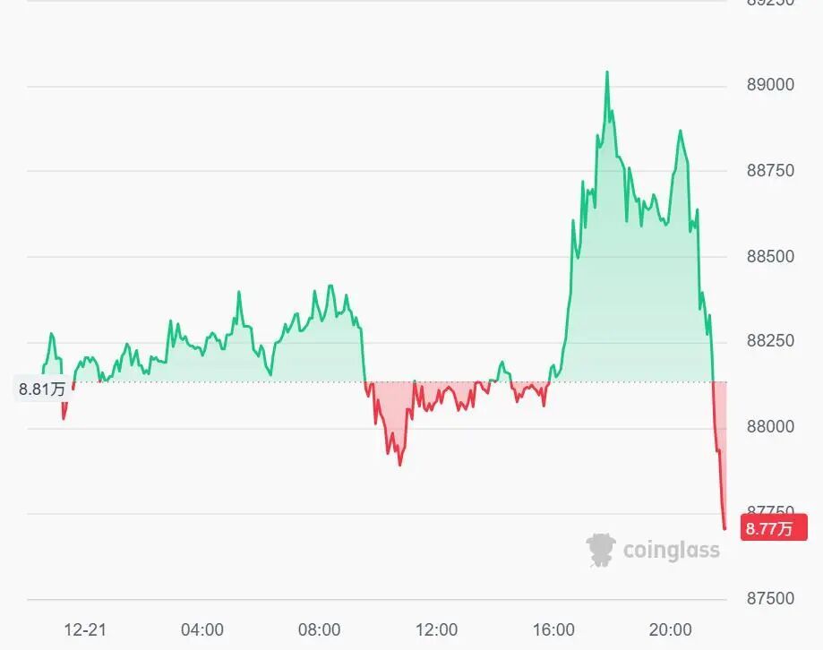 加密货币近日波动加大,12月21日比特币一度拉升,转为上涨冲上89000美元,以太坊一度站上3000美元。 截至发稿,加密货币普跌,比特币跳水转为下跌,以太坊再度跌破3000美元。 最近24小时,全球共有超8.8万人爆仓。 | 总爆仓 | | | | | --- | --- | --- | --- | | 1小时爆仓 | $2436.55万 | 4小时爆仓 | $4423.96万 | | 多更 | $2147.07万 | 多車 | $3732.36万 | | 空車 | $289.48万 | 空单 | $691.60万 | | 12小时爆仓 | $7483.73万 | 24小时爆仓 | $1.09亿 | | 多車 | $4561.48万 | 多单 | $5949.89万 | | 空車 | $2922.25万 | 空車 | $4930.40万 | 消息面上,关于美联储未来降息,传来新消息。 据金十数据报道,美联储哈玛克表示,美联储在过去三次会议上连续降息后,未来几个月内没有任何调整利率的必要。哈玛克反 对近期的降息,因为她更担心居高不下的通胀,而非潜在的劳动力市场脆弱性。 哈玛克今年并非利率制定委员会的投票成员, ...