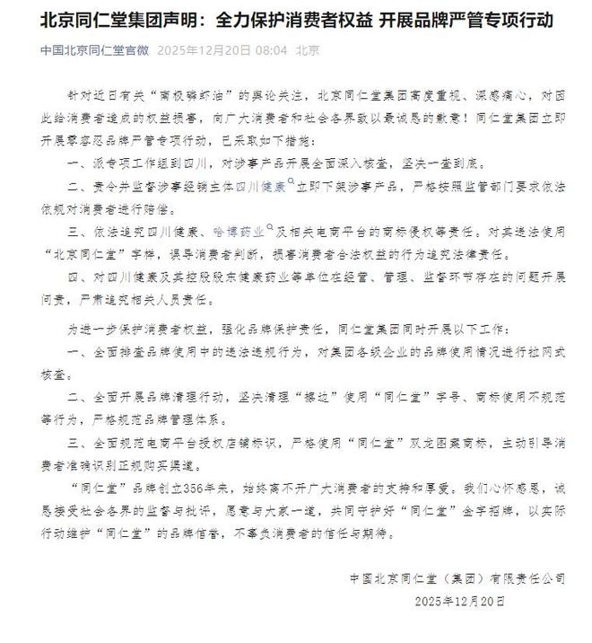 事件概述 - 北京同仁堂集团于2025年12月20日发布官方声明,就“南极磷虾油”(或“痛极殊虾油”)相关舆论事件向消费者和社会各界致歉,并宣布立即开展“零容忍品牌严管专项行动” [1][3] 已采取的紧急措施 - 公司已派遣专项工作组前往四川,对涉事产品开展全面深入核查,并表示坚决一查到底 [1][3] - 公司已责令并监督涉事经销主体“四川健康”立即下架涉事产品,并严格按照监管部门要求依法依规对消费者进行赔偿 [1] - 公司将依法追究“四川健康”、“哈博药业”及相关电商平台的商标侵权责任,对其违法使用“北京同仁堂”字样误导消费者的行为追究法律责任 [1][3] - 公司将对“四川健康”及其控股股东“健康药业”等单位在经营、管理、监督环节存在的问题开展问责,严肃追究相关人员责任 [1][3] 后续品牌保护与规范行动 - 公司将全面排查品牌使用中的违法违规行为,对集团各级企业的品牌使用情况进行拉网式核查 [2][4] - 公司将全面开展品牌清理行动,坚决清理“擦边”使用“同仁堂”字号、商标使用不规范等行为,严格规范品牌管理体系 [2][4] - 公司将全面规范电商平台授权店铺标识,严格使用“同仁堂”双龙图案商标,主动引导消费者准确识别正规购买渠道 [2][4] 公司品牌历史与承诺 - “同仁堂”品牌创立已有356年历史,公司表示其发展始终离不开消费者的支持与厚爱 [2][4] - 公司表示将心怀感恩,诚恳接受社会监督与批评,愿与各界共同守护“同仁堂”金字招牌,以实际行动维护品牌信誉,不辜负消费者信任 [2][4]