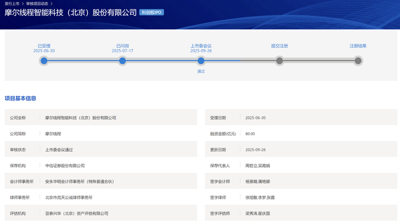 上交所官网显示,9月26日,摩尔线程智能科技(北京)股份有限公司首发申请成功通过上交所上市审核委员会会 议审议。这距离其IPO(首次公开招募)被受理仅仅88天,可以说"光速"过会。 | 发行上市 > 审核项目动态 > | | | | | | | | --- | --- | --- | --- | --- | --- | --- | | 摩尔线程智能科技(北京)股份有限公司 ■●■■ | | | | | | | | 已受理 2025-06-30 | | 已问询 2025-07-17 | 上市委会议 2025-09-26 | | 提交注册 | 注册结果 | | | | | 通过 | | | | | 项目基本信息 | | | | | | | | 公司全称 | 摩尔线程智能科技(北京)股份有限公司 | | 受理日期 | | 2025-06-30 | | | 公司简称 | 摩尔线程 | | 融资金额(亿元) | 80.00 | | | | 审核状态 | 上市委会议通过 | | 更新目期 | 2025-09-26 | | | | 保存机构 | 中信证券股份有限公司 | | 保存代表人 | | 周哲立具霞娟 | | | 会 ...