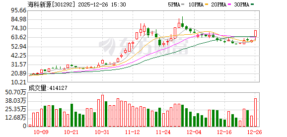 海科新源今日涨停,全天换手率48.68%,成交额27.52亿元,振幅20.00%。龙虎榜数据显示,机构净卖 出2661.32万元,营业部席位合计净买入5914.78万元。 深交所公开信息显示,当日该股因日收盘价涨幅达20.00%、日换手率达48.68%上榜,机构专用席位净 卖出2661.32万元。 证券时报·数据宝统计显示,上榜的前五大买卖营业部合计成交4.46亿元,其中,买入成交额为2.39亿 元,卖出成交额为2.07亿元,合计净买入3253.46万元。 | 买/卖 | 会员营业部名称 | 买入金额(万元) | 卖出金额(万元) | | --- | --- | --- | --- | | 买一 | 机构专用 | 5946.75 | 5079.74 | | 买二 | 开源证券股份有限公司西安西大街证券营业部 | 5527.48 | 117.92 | | 买三 | 机构专用 | 4219.00 | 5320.32 | | 买四 | 东方证券股份有限公司无锡梁清路证券营业部 | 3276.76 | 44.77 | | 买五 | 机构专用 | 3040.88 | 2042.41 | | 卖一 | 机构专用 | 42 ...