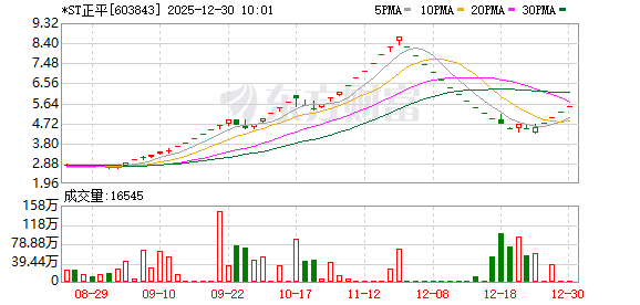 *ST正平再度涨停,7个交易日内录得5个涨停,累计涨幅为22.60%,累计换手率为36.13%。截至9:25, 该股今日成交量68.24万股,成交金额373.96万元,换手率0.10%。最新A股总市值达38.34亿元。 近日该股表现 | 日期 | 当日涨跌幅(%) | 换手率(%) | 主力资金净流入(万元) | | --- | --- | --- | --- | | 2025.12.29 | 5.03 | 0.39 | 513.22 | | 2025.12.26 | 5.07 | 5.42 | -141.91 | | 2025.12.25 | 5.11 | 0.30 | 722.48 | | 2025.12.24 | 0.90 | 8.61 | 551.48 | | 2025.12.23 | -4.90 | 8.05 | -4297.30 | | 2025.12.22 | 4.92 | 13.27 | -251.89 | | 2025.12.19 | -4.89 | 10.38 | -3239.01 | | 2025.12.18 | -5.05 | 14.42 | -10449.69 | | 2025.12 ...