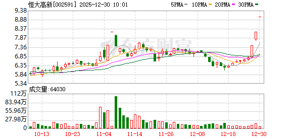 龙虎榜数据显示,该股因连续三个交易日内,涨幅偏离值累计达20%上榜龙虎榜1次,买卖居前营业部 中,机构净卖出579.43万元,营业部席位合计净买入4816.19万元。 据天眼查APP显示,江西恒大高新技术股份有限公司成立于1994年09月01日,注册资本30019.9484万人 民币。(数据宝) (文章来源:证券时报网) 恒大高新盘中涨停,已连收3个涨停板,截至9:25,该股报9.02元,换手率1.42%,成交量317.90万股, 成交金额2867.46万元,涨停板封单金额为2.86亿元。连续涨停期间,该股累计上涨33.23%,累计换手 率为14.54%。最新A股总市值达27.08亿元,A股流通市值20.16亿元。 近日该股表现 | 日期 | 当日涨跌幅(%) | 换手率(%) | 主力资金净流入(万元) | | --- | --- | --- | --- | | 2025.12.29 | 10.07 | 7.55 | 4068.28 | | 2025.12.26 | 10.04 | 5.57 | 4303.90 | | 2025.12.25 | 1.80 | 4.00 | 128.27 | | 2025.1 ...