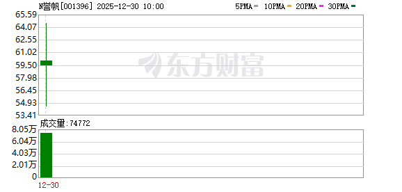 N誉帆今日上市,开盘价60.00元,上涨169.18%。 公司主要从事排水管网系统的智慧诊断与健康评估、病害治理以及运营维护业务,业务体系完整、具有 独立经营能力。 近期上市新股首日表现 | 代码 | 简称 | 上市日期 | 发行价 | 发行市盈率 | 首日开盘涨跌幅 | 所属行业 | | --- | --- | --- | --- | --- | --- | --- | | | | | (元) | (倍) | (%) | | | 688809 | N强一 | 2025.12.30 | 85.09 | 48.55 | 212.14 | 电子 | | 001369 | N双欣 | 2025.12.30 | 6.85 | 16.19 | 186.13 | 基础化工 | | 001396 | N誉帆 | 2025.12.30 | 22.29 | 19.77 | 169.18 | 建筑装饰 | | 920121 | 江天科技 | 2025.12.25 | 21.21 | 14.50 | 187.60 | 轻工制造 | | 688805 | C健信 | 2025.12.24 | 18.58 | 61.97 | 250. ...