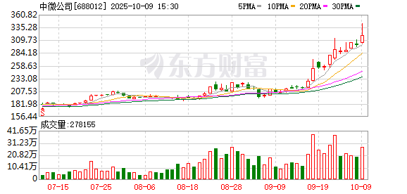证券时报·数据宝统计显示,中微公司今日收盘价为319.11元,上涨6.73%,日换手率为4.44%,成交额 为89.06亿元,全天主力资金净流入2568.81万元,近5日该股累计上涨9.85%,近5日资金合计净流入1.05 亿元。 两融数据显示,该股最新融资余额为36.73亿元,近5日减少4.32亿元,降幅为10.53%。(数据宝) 10月9日中微公司大宗交易一览 | 成交量 | 成交金 | 成交价 | 相对当日收盘 | | | | --- | --- | --- | --- | --- | --- | | (万 | 额(万 | 格 | 折溢价(%) | 买方营业部 | 卖方营业部 | | 股) | 元) | (元) | | | | | 30.00 | 8676.60 | 289.22 | -9.37 | 机构专用 | 中国国际金融股份有限公司北 | | | | | | | 京建国门外大街证券营业部 | | 30.00 | 8676.60 | 289.22 | -9.37 | 机构专用 | 中国国际金融股份有限公司北 | | | | | | | 京建国门外大街证券营业部 | | 20.00 | 5784.40 ...