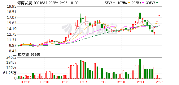 海南发展盘中涨停,已连收3个涨停板,截至9:25,该股报17.59元,换手率0.23%,成交量184.14万股, 成交金额3239.02万元,涨停板封单金额为20.66亿元。连续涨停期间,该股累计上涨33.06%,累计换手 率为22.67%。最新A股总市值达148.63亿元,A股流通市值141.34亿元。 证券时报·数据宝统计,两融数据来看,该股最新(12月22日)两融余额为5.29亿元,其中,融资余额 5.26亿元,较前一个交易日增加8393.89万元,环比增长18.98%,近3日累计增加7511.24万元,环比增长 16.65%。 公司12月23日在交易所互动平台中披露,截至最新(12月20日)股东户数为133515户,较上期(12月10 日)增加12254户,环比增长10.11%。这是该股股东户数连续第2期增长,也就是说筹码呈持续分散趋 势。 据天眼查APP显示,海控南海发展股份有限公司成立于1995年06月22日,注册资本84495.7867万人民 币。(数据宝) 近日该股表现 | 日期 | 当日涨跌幅(%) | 换手率(%) | 主力资金净流入(万元) | | --- | --- | --- | - ...