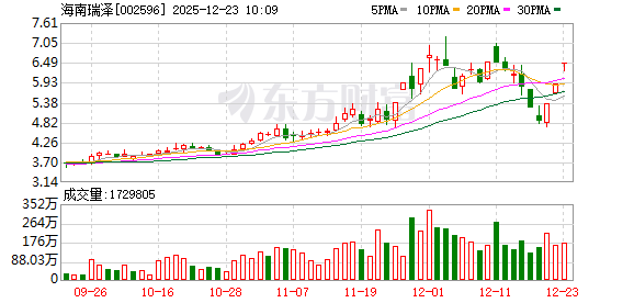 海南瑞泽盘中涨停,已连收3个涨停板,截至9:25,该股报6.48元,换手率1.17%,成交量1342.20万股, 成交金额8697.46万元,连续涨停期间,该股累计上涨33.33%,累计换手率为34.45%。最新A股总市值 达74.36亿元,A股流通市值74.29亿元。 | 日期 | 当日涨跌幅(%) | 换手率(%) | 主力资金净流入(万元) | | --- | --- | --- | --- | | 2025.12.22 | 10.09 | 14.29 | 15981.58 | | 2025.12.19 | 10.08 | 18.99 | 9765.22 | | 2025.12.18 | -6.90 | 13.42 | -883.57 | | 2025.12.17 | -10.00 | 11.28 | -6362.21 | | 2025.12.16 | -6.00 | 16.00 | -6628.17 | | 2025.12.15 | -2.53 | 12.34 | -1534.51 | | 2025.12.12 | -2.62 | 14.30 | -579.85 | | 2025.12.11 | -0 ...
