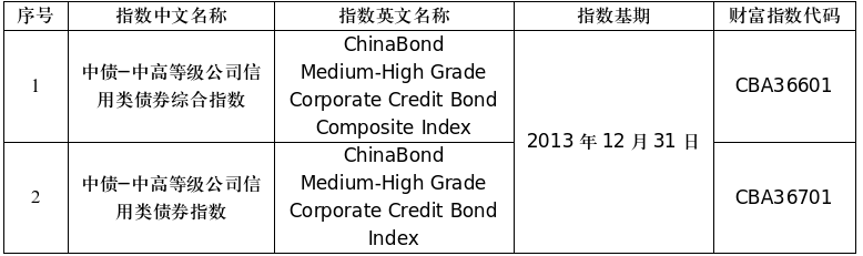 | 序号 | 指数中文名称 | 指数英文名称 | 指数基期 | 财富指数代码 | | --- | --- | --- | --- | --- | | | 中债-中高等级公司信 | ChinaBond Medium-High Grade | 2013年12月31日 | CBA36601 | | | 用类债券综合指数 | Corporate Credit Bond | | | | | | Composite Index | | | | 2 | 中债-中高等级公司信 | ChinaBond | | CBA36701 | | | | Medium-High Grade | | | | | 用类债券指数 | Corporate Credit Bond | | | | | | Index | | | 上述指数基点值为100,包含1年以下、0-3年、0-5年、0-7年、0-10年、1-3年(含1年)、1-5年(含1年)、1-7 年(含1年)、1-10年(含1年)、3-5年(含3年)、5-7年(含5年)、5-10年(含5年)、7-10年(含7年)、10 年以上(含10年)分段子指数。指数成分券原则上每月调整。 新华财经北京1 ...