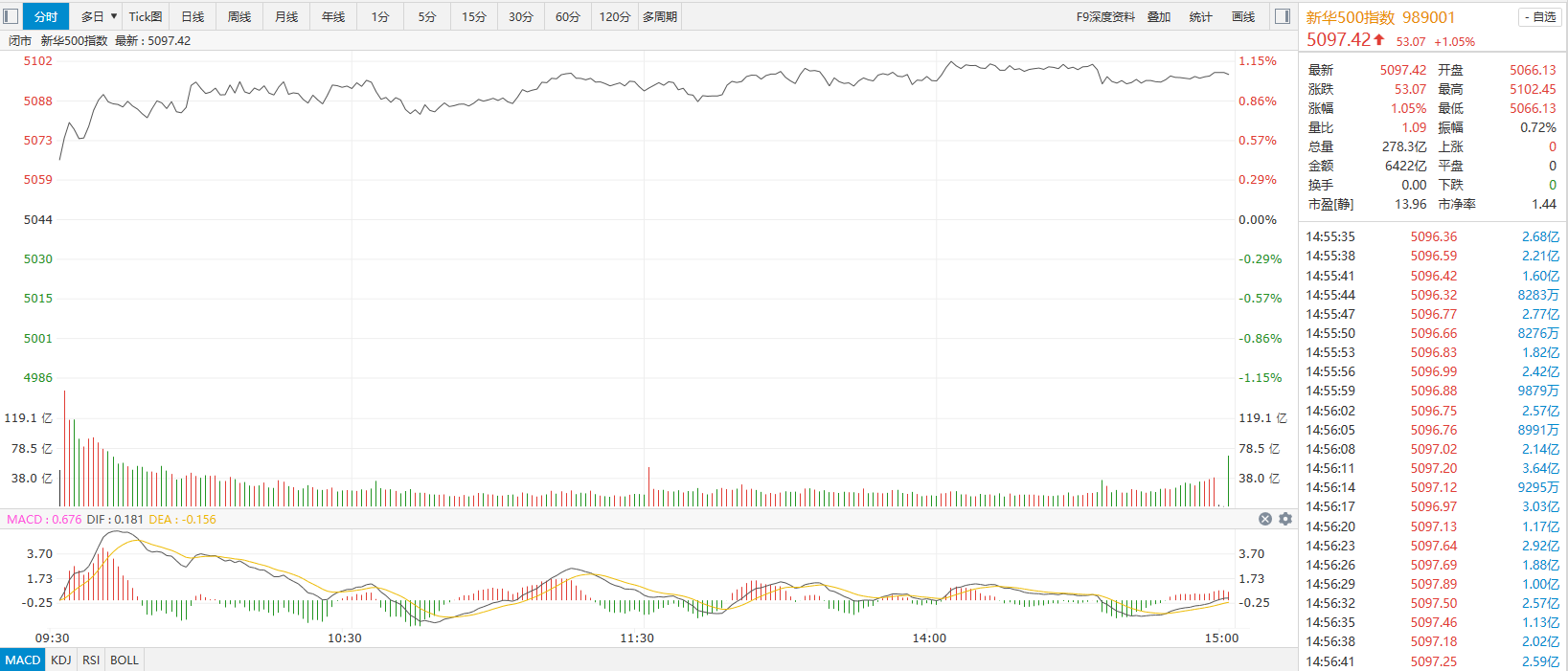新华财经北京12月22日电 (胡晨曦)新华500指数(989001)12月22日收盘涨1.05%,报5097.42点。 走势上看,新华500指数(989001)22日早间高开,指数全天震荡走强,最终大幅收涨。指数盘中最高触及5102.45点,最低触及5066.13点,成分股全天总成 交额报6422亿元。 成分股方面,高德红外、环旭电子、亨通光电、立昂微等成分股涨幅居前;华侨城A、扬农化工、万达电影、三棵树等成分股跌幅靠前。 (文章来源:新华财经) ...