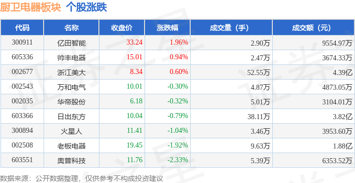 | 代码 | 名称 | 主力净流入(元) | 主力净占比 游资净流入(元) | | 游资净占比 散户净流入 (元) | | 散户净占比 | | --- | --- | --- | --- | --- | --- | --- | --- | | 002508 | 老板电器 | 1303.74万 | 6.92% | -177.53万 | -0.94% | -1126.21万 | -5.98% | | 002677 浙江美大 | | 674.94万 | 1.54% | 1914.80万 | 4.36% | -2589.74万 | -5.90% | | 605336 帅丰电器 | | 561.83万 | 15.29% | -25.82万 | -0.70% | -536.01万 | -14.59% | | 002543 万和电气 | | 525.67万 | 10.79% | -28.46万 | -0.58% | -497.21万 | -10.20% | | 002035 华帝股份 | | -15.94万 | -0.51% | 27.57万 | 0.89% | -11.63万 | -0.37% | | 300911 亿田 ...