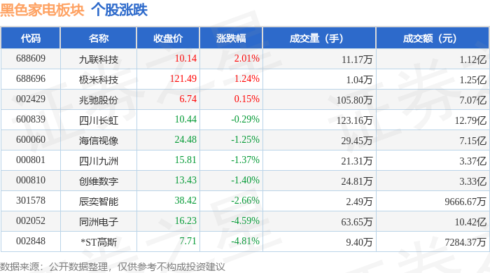 证券之星消息,9月29日黑色家电板块较上一交易日下跌0.8%,*ST高斯领跌。当日上证指数报收于 3862.53,上涨0.9%。深证成指报收于13479.43,上涨2.05%。黑色家电板块个股涨跌见下表: | 代码 | 名称 | 收盘价 | 涨跌幅 | 成交量(手) | 成交额(元) | | --- | --- | --- | --- | --- | --- | | 688609 | 九联科技 | 10.14 | 2.01% | 11.17万 | 1.12亿 | | 688696 | 极米科技 | 121.49 | 1.24% | 1.04万 | 1.25亿 | | 002429 | 非驰股份 | 6.74 | 0.15% | 105.80万 | 7.07亿 | | 600839 | 四川长虹 | 10.44 | -0.29% | 123.16万 | 12.79亿 | | 600060 | 海信视像 | 24.48 | -1.25% | 29.45万 | 7.15亿 | | 000801 | 四川九洲 | 15.81 | -1.37% | 21.31万 | 3.37亿 | | 000810 | 创维数字 | ...