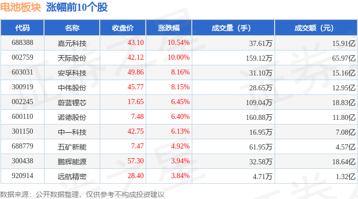 电池板块市场表现 - 2023年12月24日,电池板块整体上涨0.37%,表现强于大盘,当日上证指数上涨0.53%,深证成指上涨0.88% [1] - 板块内领涨个股为嘉元科技,单日涨幅达10.54%,收盘价为43.10元,成交额为15.91亿元 [1] - 天际股份涨幅为10.00%,收盘价为42.12元,成交额为65.97亿元 [1] - 安孚科技上涨8.16%,中伟股份上涨8.15%,蔚蓝锂芯上涨6.45%,诺德股份上涨6.40%,中一科技上涨6.13% [1] - 板块内部分个股下跌,其中滨海能源跌幅最大,为-3.82%,芳源股份下跌-3.45%,天华新能下跌-3.11% [2] 板块资金流向 - 当日电池板块整体呈现主力资金净流入,净流入金额为6.48亿元 [2] - 游资资金呈现净流出,净流出金额为8.03亿元 [2] - 散户资金呈现净流入,净流入金额为1.55亿元 [2] - 天际股份获得主力资金净流入8.90亿元,主力净占比达13.49%,但同时遭遇游资净流出5.68亿元,散户净流出3.21亿元 [3] - 蔚蓝锂芯主力资金净流入3.24亿元,主力净占比17.21% [3] - 亿纬锂能主力资金净流入1.78亿元,主力净占比6.52% [3] - 宁德时代主力资金净流入1.17亿元,主力净占比1.48%,但遭遇游资净流出2.02亿元 [3] - 德福科技、安孚科技、诺德股份等公司也获得超亿元的主力资金净流入 [3]