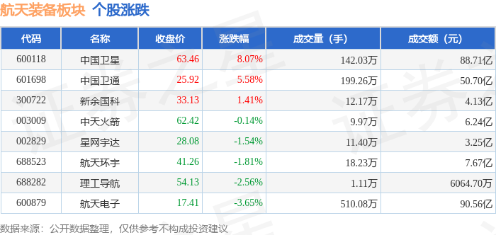 | 代码 | 名称 | 主力净流入 (元) | 主力净占比 游资净流入 (元) | | 游资净占比 散户净流入 (元) | | 散户净点比 | | --- | --- | --- | --- | --- | --- | --- | --- | | 601698 中国卫通 | | 2.83亿 = | 5.58% | -1.09亿 | -2.15% | -1.74亿 | -3.43% | | 600118 中国卫星 | | 1.12 Z | 1.26% | -3313.08万 | -0.37% | -7899.89万 | -0.89% | | 688523 航天环宇 | | 4056.92万 | 5.29% | 2584.12万 | 3.37% | -6641.04万 | -8.66% | | 300722 新会国科 | | -134.42万 | -0.33% | 168.95万 | 0.41% | -34.53万 | -0.08% | | 688282 理工导航 | | -728.65万 | -12.01% | 421.65万 | 6.95% | 307.00万 | 5.06% | | 003009 中天火箭 ...