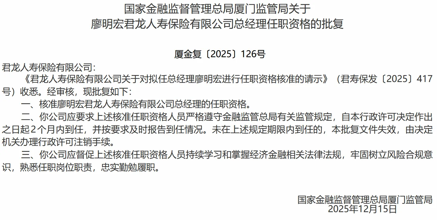 12月16日,国家金融监督管理总局厦门监管局发布批复,核准廖明宏君龙人寿保险有限公司总经理的任职资格。 批复显示,君龙人寿应要求上述核准任职资格人员严格遵守金融监管总局有关监管规定,自本行政许可决定作出之日起2个月内到任,并按要求及时报告到 任情况。未在上述规定期限内到任的,本批复文件失效,由决定机关办理行政许可注销手续。 (国家金融监督管理总局) 君龙人寿应督促上述核准任职资格人员持续学习和掌握经济金融相关法律法规,牢固树立风险合规意识,熟悉任职岗位职责,忠实勤勉履职。 ...
