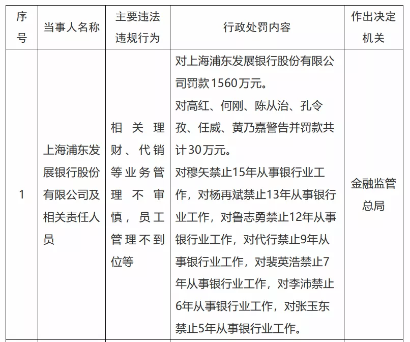 (国家金融监督管理总局) | 序 | 当事人名称 | 主要违法 | 行政处罚内容 | 作出决定 | | --- | --- | --- | --- | --- | | 를 | | 违规行为 | 对上海浦东发展银行股份有限公 | 机关 | | | | 相 关 理 | 司罚款 1560万元。 对高红、何刚、陈从治、孔令 孜、任威、黄乃嘉警告并罚款共 | | | | 上海浦东发 | 财、代销 | 计30万元。 | | | | 展银行股份 | 等业务管 | 对穆矢禁止15年从事银行业工 | | | 1 | 有限公司及 | 理 不 审 | 作,对杨再斌禁止13年从事银行 | 我都是是 | | | 相关责任人 | 慎,员工 | 业工作,对鲁志勇禁止12年从事 | 总局 | | | 员 | 管理不到 | 银行业工作,对代行禁止9年从 | | | | | 位等 | 事银行业工作,对裴英浩禁止7 | | | | | | 年从事银行业工作,对李沛禁止 | | | | | | 6年从事银行业工作,对张玉东 | | | | | | 禁止5年从事银行业工作。 | | 12月19日,国家金融监督管理总局披露的行政处罚信息显示,因存在相关 ...