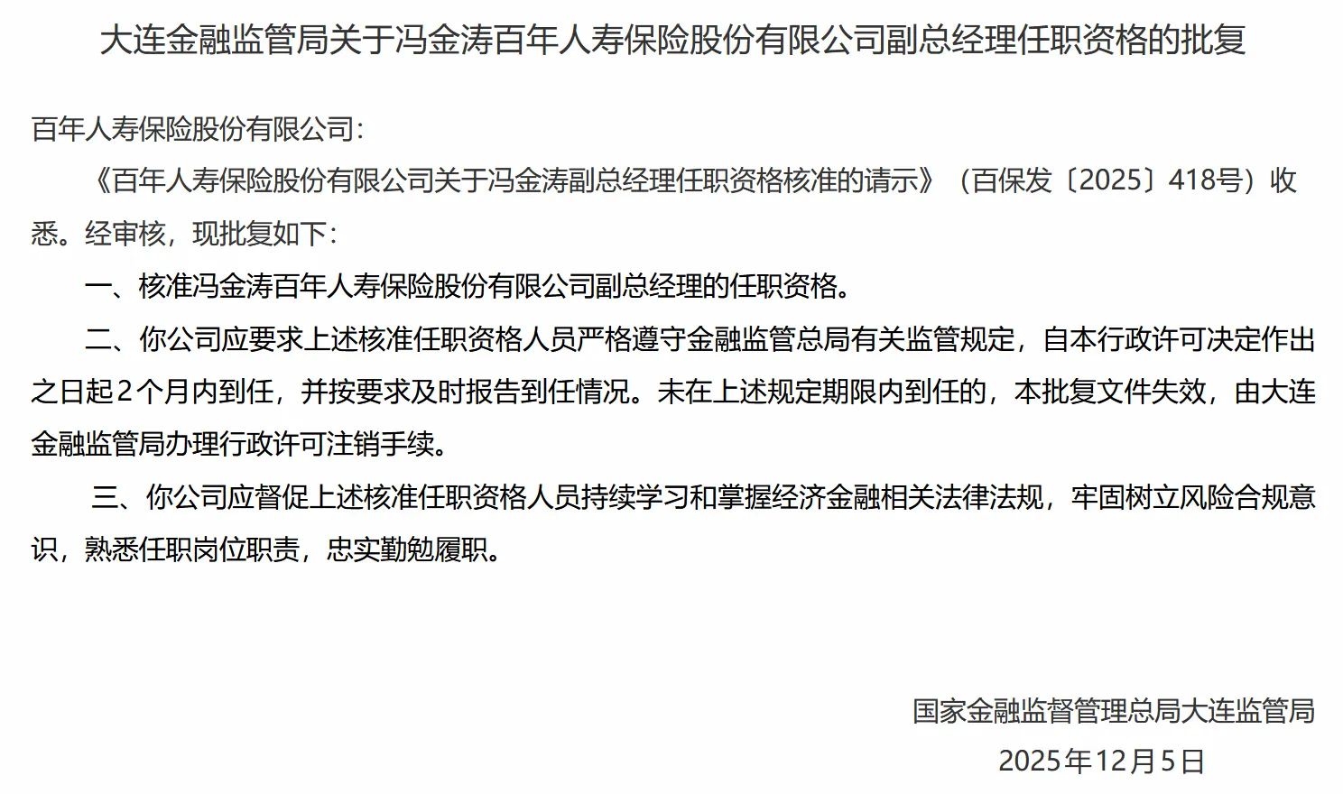 公司高管任职资格核准 - 国家金融监督管理总局大连监管局于12月17日核准冯金涛担任百年人寿保险股份有限公司副总经理的任职资格 [1] - 监管要求核准人员须严格遵守金融监管总局的监管规定 [1] - 该行政许可决定要求冯金涛自决定作出之日起2个月内到任 否则批复失效并由大连金融监管局办理注销手续 [1] 公司对高管的管理要求 - 百年人寿需督促冯金涛持续学习经济金融相关法律法规 并牢固树立风险合规意识 [1] - 公司需督促其熟悉任职岗位职责 并做到忠实勤勉履职 [1] - 公司需按要求及时向监管报告冯金涛的到任情况 [1]