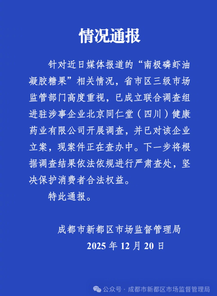 成都市新都区市场监督管理局 2025 年 12 月 20 日 % 公众号 ·成都市新都区市场监督管理局 针对近日媒体报道的"南极磷虾油 凝胶糖果"相关情况,省市区三级市场 监管部门高度重视,已成立联合调查组 进驻涉事企业北京同仁堂(四川)健康 药业有限公司开展调查,并已对该企业 立案,现案件正在查办中。下一步将根 据调查结果依法依规进行严肃查处,坚 决保护消费者合法权益。 特此通报。 【#成都通报南极磷虾油事件#:已成立联合调查组开展调查】#成都成立调查组调查南极磷虾油涉事企 业#12月20日,成都市新都区市场监督管理局发布情况通报:针对近日媒体报道的"南极磷虾油凝胶糖 果"相关情况,省市区三级市场监管部门高度重视,已成立联合调查组进驻涉事企业北京同仁堂(四 川)健康药业有限公司开展调查,并已对该企业立案,现案件正在查办中。下一步将根据调查结果依法 依规进行严肃查处,坚决保护消费者合法权益。(人民财讯) 情况通报 ...