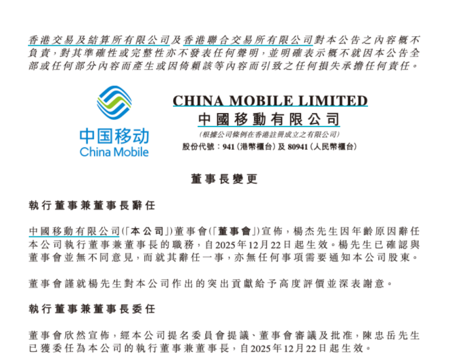 【导读】中国移动委任陈忠岳为执行董事兼董事长 12月22日,中国移动(600941)港股率先发布公告称,杨杰因年龄原因辞任公司执行董事兼董事长的职务,自12月22日起生效。 经公司提名委员会提议、董事会审议及批准,陈忠岳已获委任为公司执行董事兼董事长,自12月22日起生效。 目前,中国移动官网已对高管信息进行更新。履历信息显示,陈忠岳,54岁,于2025年12月加入公司董事会,主持公司全面工作,并分管内部审计工作。 现为中国移动通信集团有限公司董事长,中国移动通信有限公司董事、董事长。 陈忠岳为经济学硕士,曾先后担任中国电信(601728)浙江分公司副总经理,中国电信公众客户事业部总经理,中国电信山西分公司总经理,中国电信集 团有限公司副总经理,中国电信股份有限公司执行董事兼执行副总裁,中国联合网络通信集团有限公司总经理、董事长,中国联合网络通信股份有限公司 (于上海上市)和中国联合网络通信有限公司的总裁、董事长,以及中国联合网络通信(香港)股份有限公司(于香港上市)总裁、执行董事、董事长兼 首席执行官,具有丰富的管理及电信行业从业经验。 今年前三季度,中国移动实现营收7946.66亿元,同比增长0.41%, ...