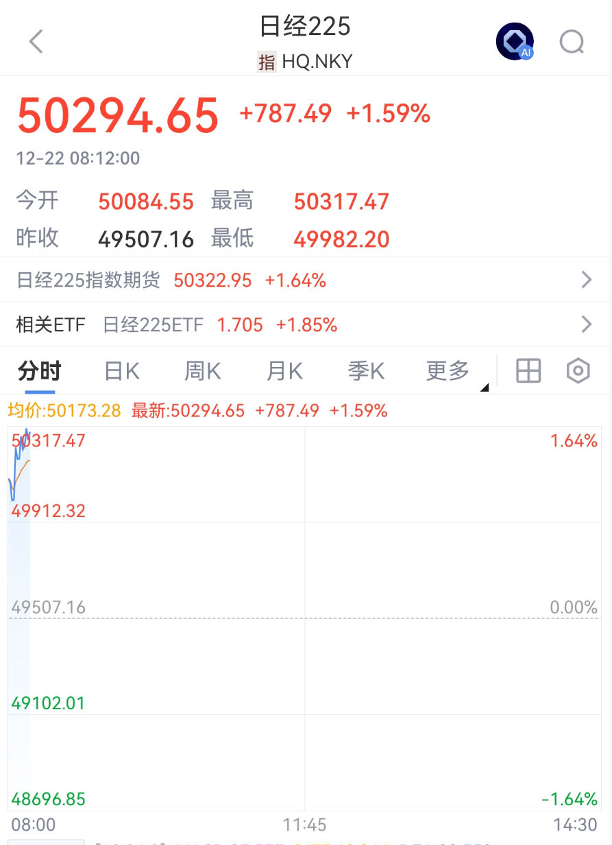 【导读】日韩股市开盘集体大涨 大家好!来一起关注日韩股市的最新情况~ 日本股市开盘走高 12月22日,日本股市早间明显高开。日经225指数开盘报50084.55点,涨超1%。开盘后奋力上攻,盘初涨超1.6%。东证指数涨 超1%。 | 日经225 | | | | --- | --- | --- | | 指 HQ.NKY | | | | 50294.65 +787.49 +1.59% | | | | 12-22 08:12:00 | | | | 今开 50084.55 最高 | 50317.47 | | | 昨收 49507.16 最低 | 49982.20 | | | 日经225指数期货 50322.95 +1.64% | | | | 相关ETF 日经225ETF 1.705 +1.85% | | | | 分时 日K 周K 月K 季K | | 更多 円 ◎ | | 均价:50173.28 最新:50294.65 +787.49 +1.59% | | | | 50317.47 | | 1.64% | | 49912.32 | | | | 49507.16 | | 0.00% | | 49102.01 | | | ...