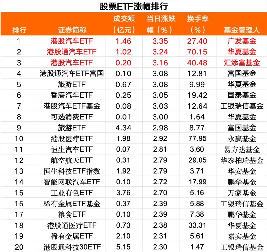 【导读】上周五股票ETF资金净流入超136亿元 中国基金报记者天心 上周五(12月19日),A股市场呈现普涨格局。三大指数集体收涨,沪深两市成交额为1.74万亿元。 资金强势入场。上周五全市场股票ETF(含跨境ETF)资金净流入超136亿元,跟踪中证A500、上证50、中证500、中证1000等宽基的ETF,以及红利主题 ETF资金净流入金额靠前。 整周来看,股票ETF上周连续五个交易日实现资金净流入,累计流入金额超600亿元。其中,中证A500指数相关ETF大幅"吸金"超326亿元,恒生科技相关 ETF资金净流入超52亿元。 | | | 股票ETF涨幅排行 | | | | | --- | --- | --- | --- | --- | --- | | | | 成交额 | 景日涨跌 | 换手率 | | | 排行 | 证券简称 | (亿元) | 幅(%) | (%) | 基金管理人 | | 1 | 港股汽车ETF | 1.46 | 3.35 | 27.40 | 广发基金 | | 2 | 港股通汽车ETF | 1.02 | 3.24 | 70.15 | 中直音等 | | 3 | 港股汽车ETF | 0.20 | ...