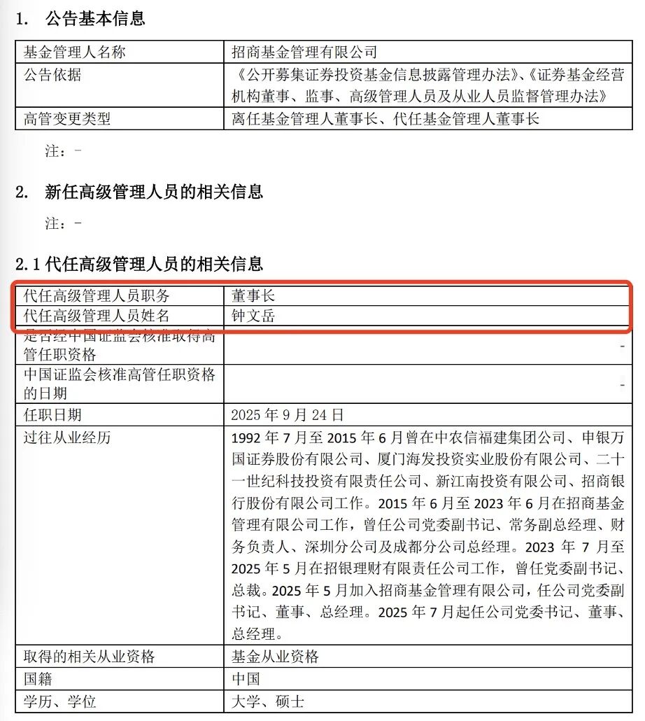 钟文岳代任 9月23日晚,招商基金发布高级管理人员变更公告称,王小青因工作安排自9月24日起离任董事长,不再转任公司其他岗位,由公司总经理钟文岳代任招商 基金董事长一职。 【导读】王小青正式离任招商基金董事长,钟文岳代任 又有公募巨头出现高管变更。 继上月请辞招商银行副行长后,王小青正式官宣离任招商基金董事长,由公司总经理钟文岳代任。目前,王小青已在招商局金融控股有限公司(下称招商 金控)出任总经理一职。 王小青正式离任招商基金董事长 | 基金管理人名称 | 招商基金管理有限公司 | | --- | --- | | 公告依据 | 《公开募集证券投资基金信息披露管理办法》、《证券基金经营 | | | 机构董事、监事、高级管理人员及从业人员监督管理办法》 | | 高管变更类型 | 离任基金管理人董事长、代任基金管理人董事长 | | 代任高级管理人员职务 | 重事长 | | --- | --- | | 代任高级管理人员姓名 | 钟文岳 | | 定台经干四班位云区"四川"同 | | | 管任职资格 | | | 中国证监会核准高管任职资格 | | | 的目期 | | | 任职目期 | 2025年9月24日 | | 过往 ...
