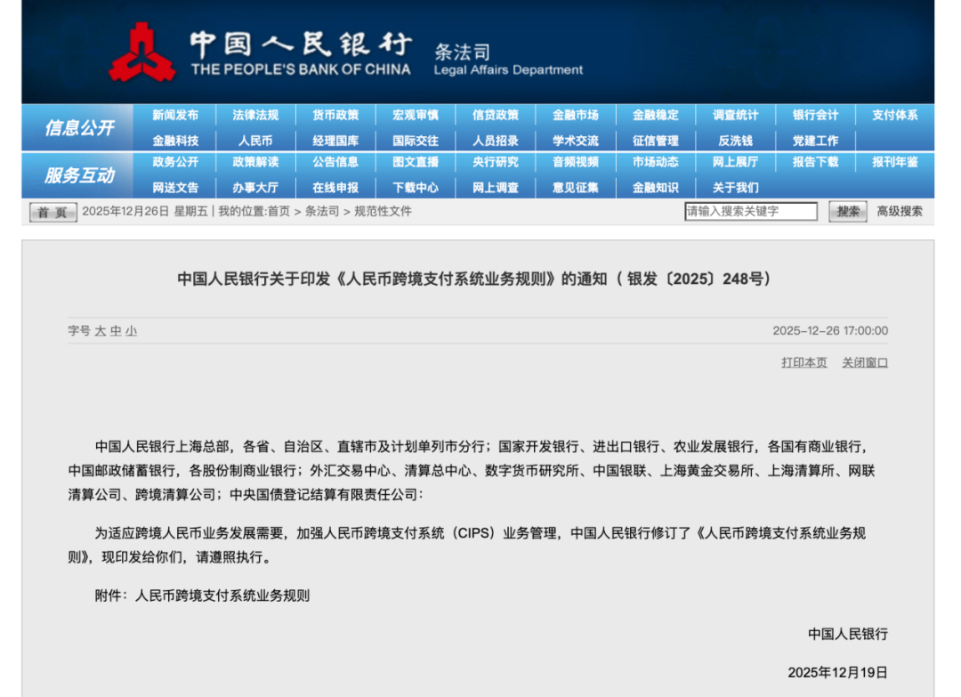 中国人民银行修订CIPS业务规则 - 中国人民银行于2025年12月26日发布修订后的《人民币跨境支付系统业务规则》,新规则旨在适应跨境人民币业务发展需要并加强CIPS业务管理,将于2026年2月1日起施行 [1] 规则适用范围与核心定义 - 规则适用于CIPS运营机构及所有CIPS参与者 [6] - CIPS运营机构是经中国人民银行批准、为境内外参与者提供跨境人民币清算结算服务的公司制企业法人 [7] - CIPS为参与者的跨境和离岸人民币支付业务、金融市场业务等提供资金清算结算服务 [9] 参与者管理 - 参与者分为直接参与者与间接参与者,直接参与者在CIPS开立账户并直接办理业务,间接参与者委托直接参与者办理业务 [10] - 境外机构申请成为直接参与者时,可委托符合条件的直接参与者作为资金托管行,相比原规则“应当委托境内银行类直接参与者”的要求,简化了参与条件 [4][12] - 运营机构负责制定参与者管理办法并履行管理主体责任,参与者需按此办法开展业务 [10][11] 账户管理规范 - 运营机构为直接参与者开立的CIPS账户为零余额账户,不计息、不得透支,日终余额必须为零 [13] - 根据业务需要,运营机构可在中国人民银行开立清算账户,用于集中存放参与者办理CIPS业务的结算资金,该账户同样不得透支且日终余额为零 [4][13] - 运营机构不得在商业银行开立账户存放CIPS参与者的结算资金,不得形成清算资金沉淀 [4][13] - 直接参与者可通过其自身或资金托管行在央行开立的清算账户对CIPS账户进行流动性管理 [13] 业务处理要求 - 银行类直接参与者应根据客户指令或间接参与者委托,以逐笔或批量方式通过CIPS办理支付业务 [14] - 金融市场基础设施类直接参与者应根据其交易或结算系统功能需要,通过CIPS办理资金结算 [14] - 直接参与者需根据业务功能向运营机构申请报文权限,申请开通净额结算报文权限的还需符合结算风险管理要求 [14][15] - 参与者需在规定业务处理时段内确保系统处于登录状态,并及时提交支付业务 [16][17][19] 结算机制 - CIPS支持混合结算模式,对逐笔发起的支付业务实行实时全额结算,对批量发起的支付业务实行定时净额结算 [21] - CIPS支持人民币付款、人民币对外币同步交收、券款对付结算、中央对手集中清算等多种跨境人民币交易结算业务 [21] - 实时全额结算时,若账户余额不足支付,业务将进入排队队列;系统设置加急和普通两种队列,加急队列内为不同业务类型设置了优先级 [21] - 直接参与者可撤销加急队列中的排队业务,但净额轧差结果和中央对手业务除外;实时全额结算业务一旦成功完成则不可撤销 [22][23] 风险管理与系统运行 - 运营机构需建立健全风险管理框架与系统,监测和管理流动性风险、业务风险、运行风险等,以保证业务正常开展 [28] - 运营机构和直接参与者需建立系统故障处理和突发事件应急处置机制,确保系统安全稳定运行及业务连续性 [29] - 运营机构和直接参与者应建立与CIPS相关的备份系统,并定期进行切换演练 [30] 附则与其他规定 - 运营机构需根据本规则制定具体操作指引,并与直接参与者签订协议约定权利义务 [31][32] - 运营机构负责制定和发布CIPS报文标准,直接参与者需按最新标准及时改造其业务系统 [34][35] - 本规则自2026年2月1日起施行,原《人民币跨境支付系统业务规则》同时废止 [36]