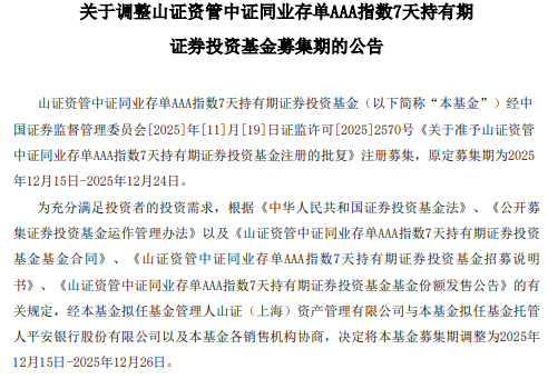 中国经济网北京12月22日讯 近日,山证(上海)资产管理有限公司发布关于调整山证资管中证同业存 单AAA指数7天持有期证券投资基金募集期的公告。 公告称,山证资管中证同业存单AAA指数7天持有期证券投资基金经中国证券监督管理委员会 [2025]年[11]月[19]日证监许可[2025]2570号《关于准予山证资管中证同业存单AAA指数7天持有期证券 投资基金注册的批复》注册募集,原定募集期为2025年12月15日-2025年12月24日。现决定将该基金募 集期调整为2025年12月15日-2025年12月26日。 该基金拟任基金经理为刘凌云2007年6月29日至2013年6月28日任光大证券股份有限公司固定收益总 部债券交易员。2013年7月在富国基金管理有限公司任高级交易员兼研究助理、基金经理。2017年4月加 入山西证券股份有限公司资管固收部担任投资主办;2018年7月转入山西证券公募基金部;2019年1月起 担任基金经理。 (责任编辑:康博) ...