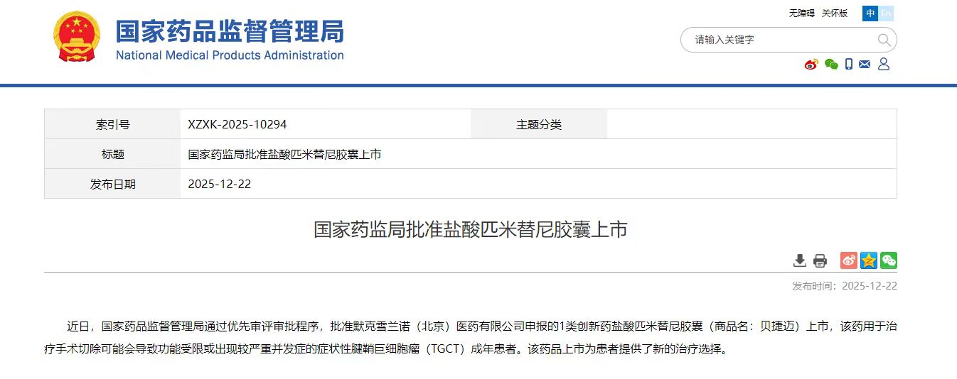 记者从国家药品监督管理局获悉,国家药监局已通过优先审评程序批准贝捷迈(盐酸匹米替尼胶囊)用于手术切除可能会导致功能受限或出现较严重并发症的 症状性腱鞘巨细胞瘤(TGCT)成年患者。 贝捷迈是一款巨噬细胞集落刺激因子-1受体抑制剂,也是国内首个获批用于TGCT治疗的一类创新药。TGCT,既往又称色素沉着绒毛结节性滑膜炎,是一 种罕见的局部侵袭性肿瘤,可导致受累关节出现进行性加重的肿胀、僵硬及活动功能受限。 | 索引号 | XZXK-2025-10294 | 主题分类 | | --- | --- | --- | | 标题 | 国家药监局批准盐酸匹米替尼胶囊上市 | | | 发布日期 | 2025-12-22 | | 贝捷迈此次获批是基于全球Ⅲ期MANEUVER的研究结果。该结果已在2025年美国临床肿瘤学会年会上公布。 北京积水潭医院骨与软组织肿瘤诊疗研究中心主任牛晓辉教授表示,中国很多TGCT患者长期面临着治疗困境——除手术外,缺乏其他的治疗选择。而对于 肿瘤复发或无法手术切除的患者,手术治疗也难以满足其需求。"基于全球MANEUVER研究的积极结果,贝捷迈在中国获批意味着临床医生有机会为患者 提供疗效确切且耐 ...