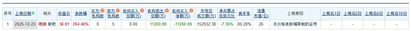 锡华科技龙虎榜交易数据 - 2025年12月23日,锡华科技收盘价为36.81元,单日涨幅为264.46% [2] - 该证券当日上榜原因为“无价格涨跌幅限制的证券” [2] 机构资金动向 - 龙虎榜数据显示,卖出金额最大的前五名席位全部为“机构专用”席位 [1] - 机构席位当日净卖出锡华科技净额为11260.89万元 [1] - 前五大机构席位合计卖出金额为11260.89万元,具体卖出额分别为2842.99万元、2734.03万元、2118.49万元、2105.33万元和1460.05万元 [4] 营业部资金动向 - 买入金额最大的前五名均为券商营业部席位,无机构席位 [4] - 前五大买入营业部合计买入10516.07万元,占总成交比例的6.88% [4] - 主要买入方为东方财富证券位于拉萨的多个营业部,其中拉萨团结路第二证券营业部买入2507.36万元,占总成交1.64% [4] - 国金证券深圳分公司买入2372.29万元,占总成交1.55% [4]