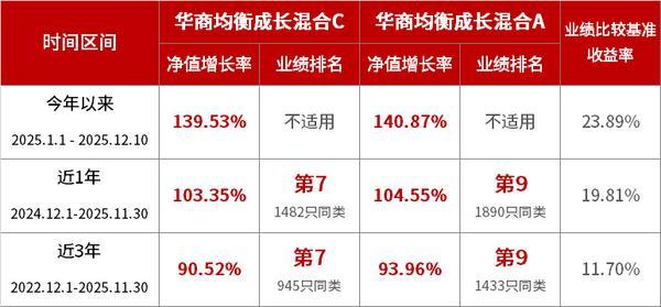 科技创新浪潮席卷全球,中国资产迎来系统性地价值重估的背景下,如何把握这一科技创新投资大时 代?华商基金权益投资副总监、华商均衡成长混合基金经理张明昕表示,要坚守价值投资,聚焦产业趋 势,追求长期可复制可持续的业绩。他管理的华商均衡成长混合基金业绩表现突出。截至2025年12月10 日,华商均衡成长混合A今年以来净值增长率高达140.87%。银河证券数据显示,截至2025年11月末, 华商均衡成长混合C近1年、3年业绩排名双双位列同类第七,为投资者在复杂多变的市场中带来了较好 的持有体验。 | 华商均衡成长混合近1年、3年业绩排名均列同类前十 | | --- | | 时间区间 | | 华商均衡成长混合C | 华商均衡成长混合A | | 业绩比较基准 收益率 | | --- | --- | --- | --- | --- | --- | | | 净值增长率 | 业绩排名 | 净值增长率 | 业绩排名 | | | 今年以来 2025.1.1 - 2025.12.10 | 139.53% | 不适用 | 140.87% | 不适用 | 23.89% | | 近1年 | 103.35% | 第7 | 104.55% | ...