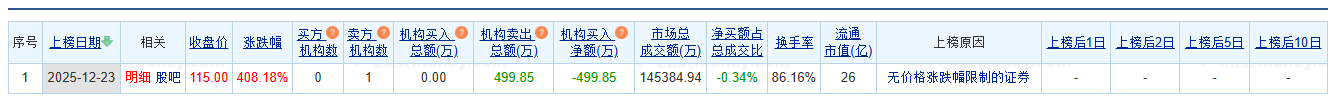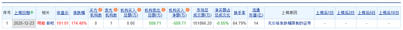 天溯计量龙虎榜交易数据摘要 - 2025年12月23日,天溯计量因属于“无价格涨跌幅限制的证券”登上龙虎榜,当日收盘价为101.01元,涨幅达174.48% [2] - 该股当日总成交额约为10.19亿元,龙虎榜上榜席位总成交额为101866.20万元,占当日总成交额的84.79% [2] 机构与营业部买卖行为 - 卖出金额最大的前五名中,有一家机构专用席位,该席位当日净卖出天溯计量559.71万元,卖出金额占总成交额的0.55% [1][3] - 买入金额最大的前五名均为东方财富证券位于拉萨的营业部,包括团结路第一、东环路第二、东环路第一、团结路第二及金融城南环路营业部,其买入金额在1132.24万元至1955.88万元之间,占总成交比例在1.11%至1.92%之间 [3] - 部分营业部同时出现在买卖前五名榜单中,呈现双向交易特征,例如东方财富证券拉萨团结路第二营业部买入1634.22万元(占比1.60%)的同时卖出493.98万元(占比0.48%) [3]