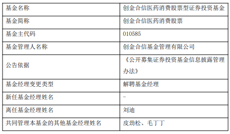 中国经济网北京12月23日讯 今日,创金合信基金公告,刘迪离任创金合信医药消费股票。 刘迪2016年7月加入南方基金管理股份有限公司,任研究部研究员,2021年5月加入宝盈基金管理有 限公司,任研究部行业研究员,2023年3月加入创金合信基金管理有限公司,任风格策略投资部基金经 理助理,现任基金经理。 创金合信医药消费股票A/C成立于2020年12月3日,截至2025年12月22日,其今年来收益率 为-5.41%、-5.86%,成立来收益率为-54.38%、-55.52%,累计净值为0.4562元、0.4448元。 | 基金名称 | 创金合信医药消费股票型证券投资基金 | | --- | --- | | 基金简称 | 创金合信医药消费股票 | | 基金主代码 | 010585 | | 基金管理人名称 | 创金合信基金管理有限公司 | | 公告依据 | 《公开募集证券投资基金信息披露管理 | | | 办法》 | | 基金经理变更类型 | 解聘基金经理 | | 新任基金经理姓名 | | | 离任基金经理姓名 | 刘迪 | | 共同管理本基金的其他基金经理姓名 | 皮劲松、毛丁丁 | (责任编辑:康博) ...