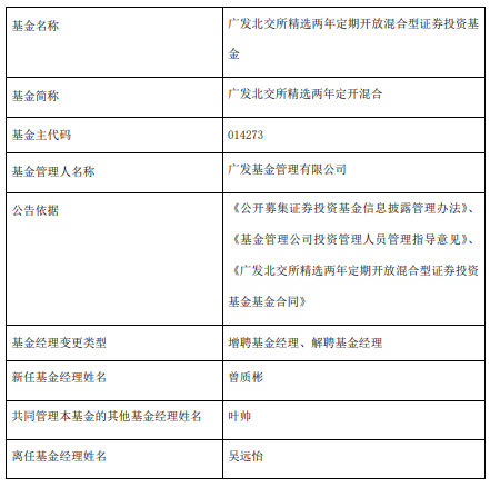 广发北交所精选两年定开混合增聘曾质彬 吴远怡离任